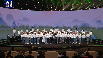 China-US youth chorus performing Jasmine Flower, Walk with Me, On the Hopeful Fields, and other Chinese and English songs.